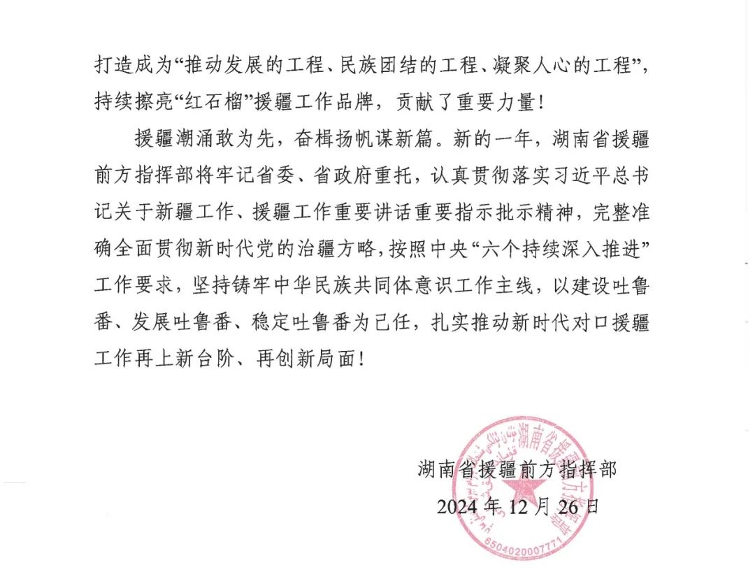 红星照耀边疆,深情跨越千山。近日,红星实业集团荣幸地收到了来自湖南省援疆前方指挥部的深情致谢函。信中高度评价了红星实业集团为推进湖南援疆事业高质量发展所做出的杰出贡献,并对集团在过去一年中,在对口援疆领域的辛勤努力与不懈付出表示了衷心的感谢。