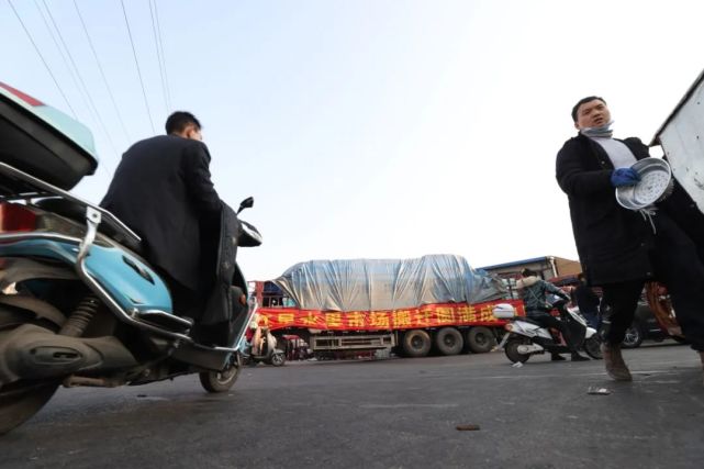 挂着横幅的卡车驶出老红星水果市场 全媒体记者 董阳 摄
