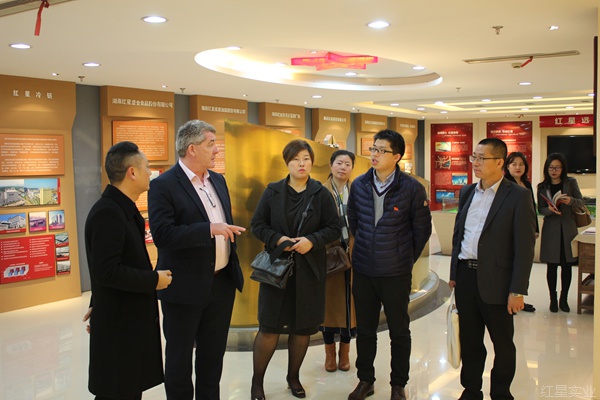 在红星大市场、红星全球农批中心,托尼·库伦先生一行每到一处,都表示出了极大的兴趣,认真听取情况介绍,还不时询问占地规模、交易份额等具体细节。在观看完红星全球农批中心宣传片后,几位贵宾深受震撼,对红星产业项目深表钦佩,连连以“great”、“excellent”、“wonderful”等词汇表示赞赏。随后,托尼一行来到红星冷链物流交易中心,实地察看冷库、牛肉及水产品档口,详细了解澳洲产品在湘销售情况。“Smart thinking.”在参观集团陈列室时,托尼对红星的发展模式给出了很高评价。