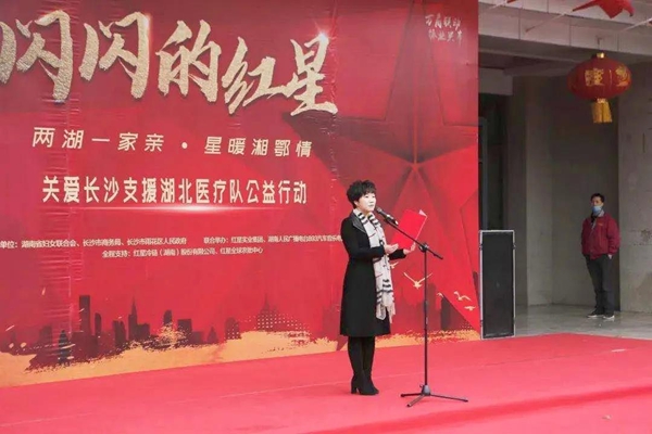 3月28日,由湖南省妇联全程指导,红星实业集团联合湖南人民广播电台893汽车音乐电台主办,红星冷链(湖南)股份有限公司、红星全球农批中心全程支持的“两湖一家亲,‘星’暖湘鄂情”——“闪闪的红星”关爱支援湖北医疗队公益行动暨爱心捐赠仪式在长沙举行。