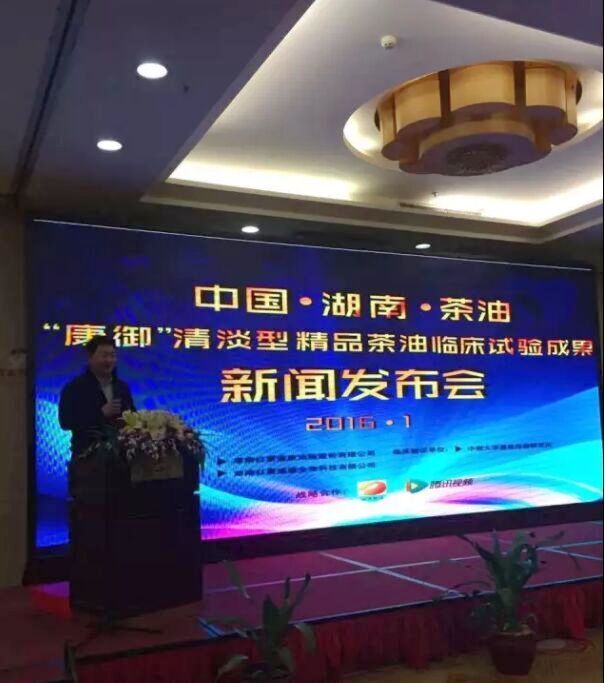 1月16日上午,中国?湖南?茶油“康御”清淡型精品茶油临床试验成果新闻发布会在通程盛源大酒店5楼隆重举行。国家林业局、中国林业产业联合会、国家油茶工程技术研究中心、省林业厅、省老年协会、中南大学高血压病研究所、市食药局、市林业局、市工商局、市老年协会、茶陵县委、茶陵县林业局等20余家单位领导和专家及红星实业集团董事长罗跃出席会议。发布会由康御茶油代言人、湖南卫视主持人李锐主持。