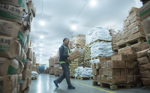 冷冻产品仓库温度低达零下18℃,工作人员必须穿着厚棉衣御寒。